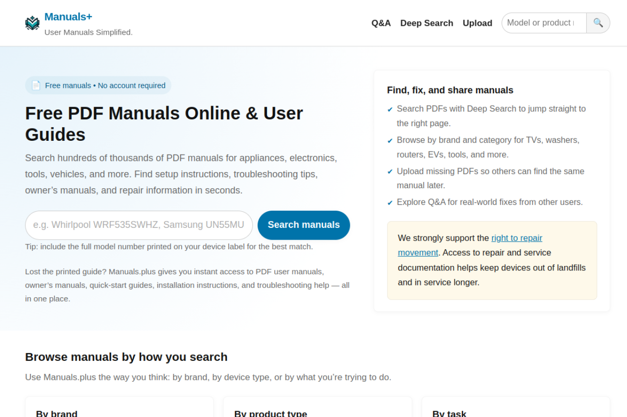 Free online manuals and user guides for appliances, electronics, vehicles, and tools. Search by brand or model and download PDFs to support repair.