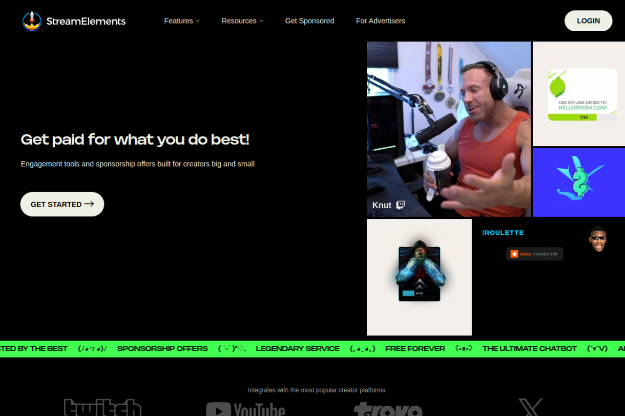 StreamElements is the leading platform for live streaming on Twitch,Youtube and Facebook gaming. StreamElements features include Overlays, Tipping, Chatbot, Alerts, merchandise, stream integrated and cloud-based.