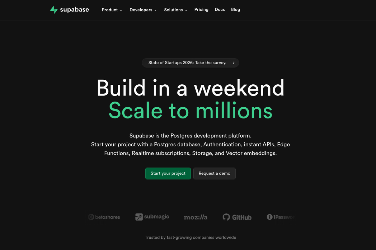 Build production-grade applications with a Postgres database, Authentication, instant APIs, Realtime, Functions, Storage and Vector embeddings. Start for free.