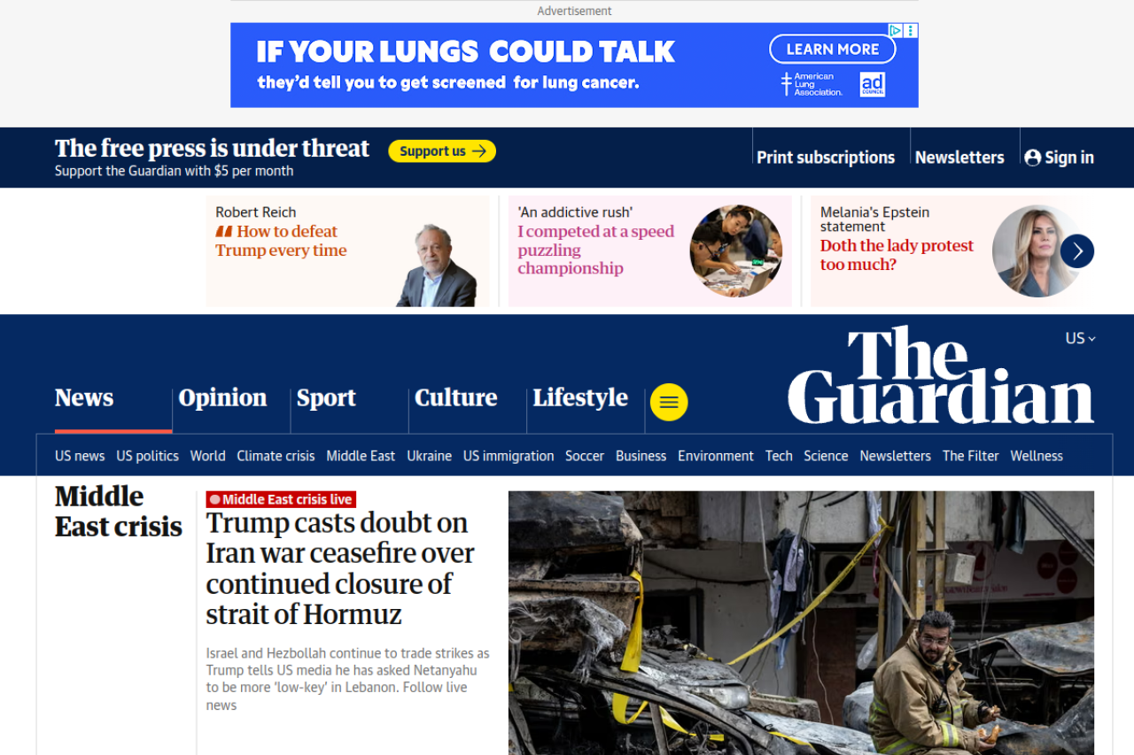 theguardian.com looks like news & weather. Traffic signals point to roughly 338.1M monthly visits. Current AI trust scoring is 5/100.