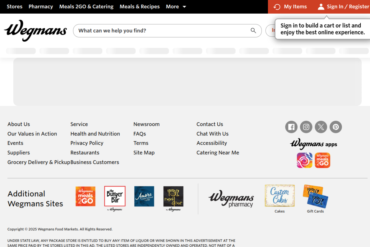 wegmans.com looks like food & drink. Traffic estimates are limited, so use the trust and structure modules first. Current AI trust scoring is 5/100.