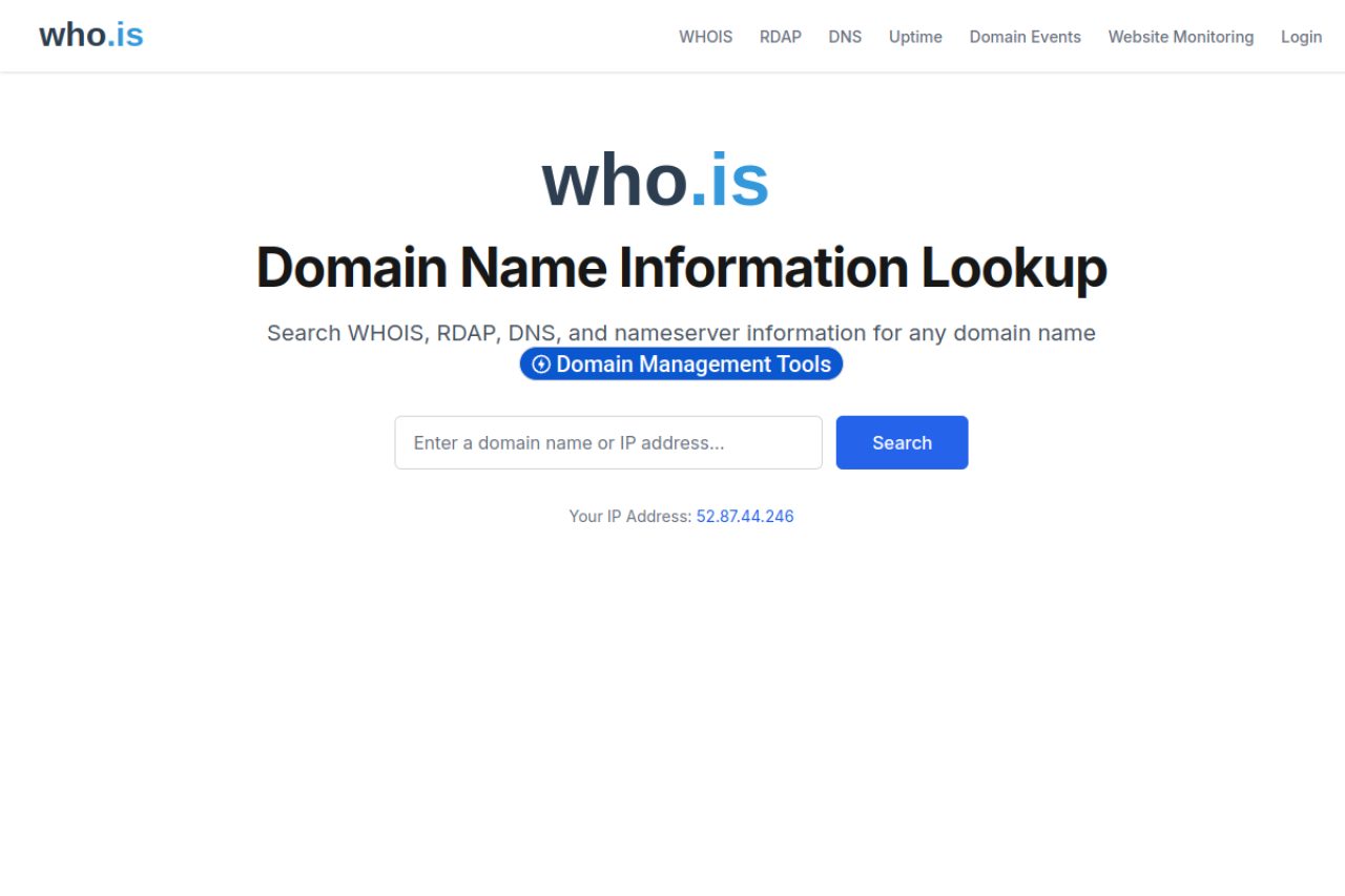 Find information on any domain name or website. Large database of whois information, RDAP, DNS, domain names, name servers, IPs, and tools for searching and monitoring domain names.